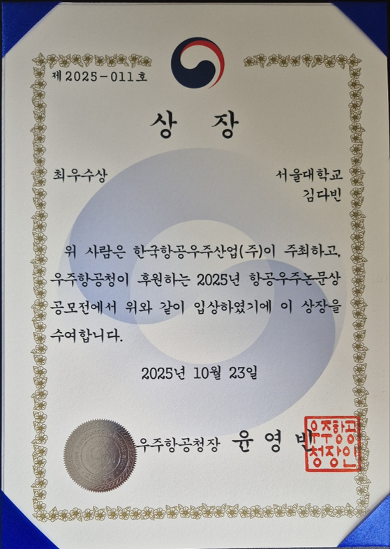 김다빈 박사과정, KAI 2025년 항공우주 논문상 공모전 ‘최우수상’ 수상