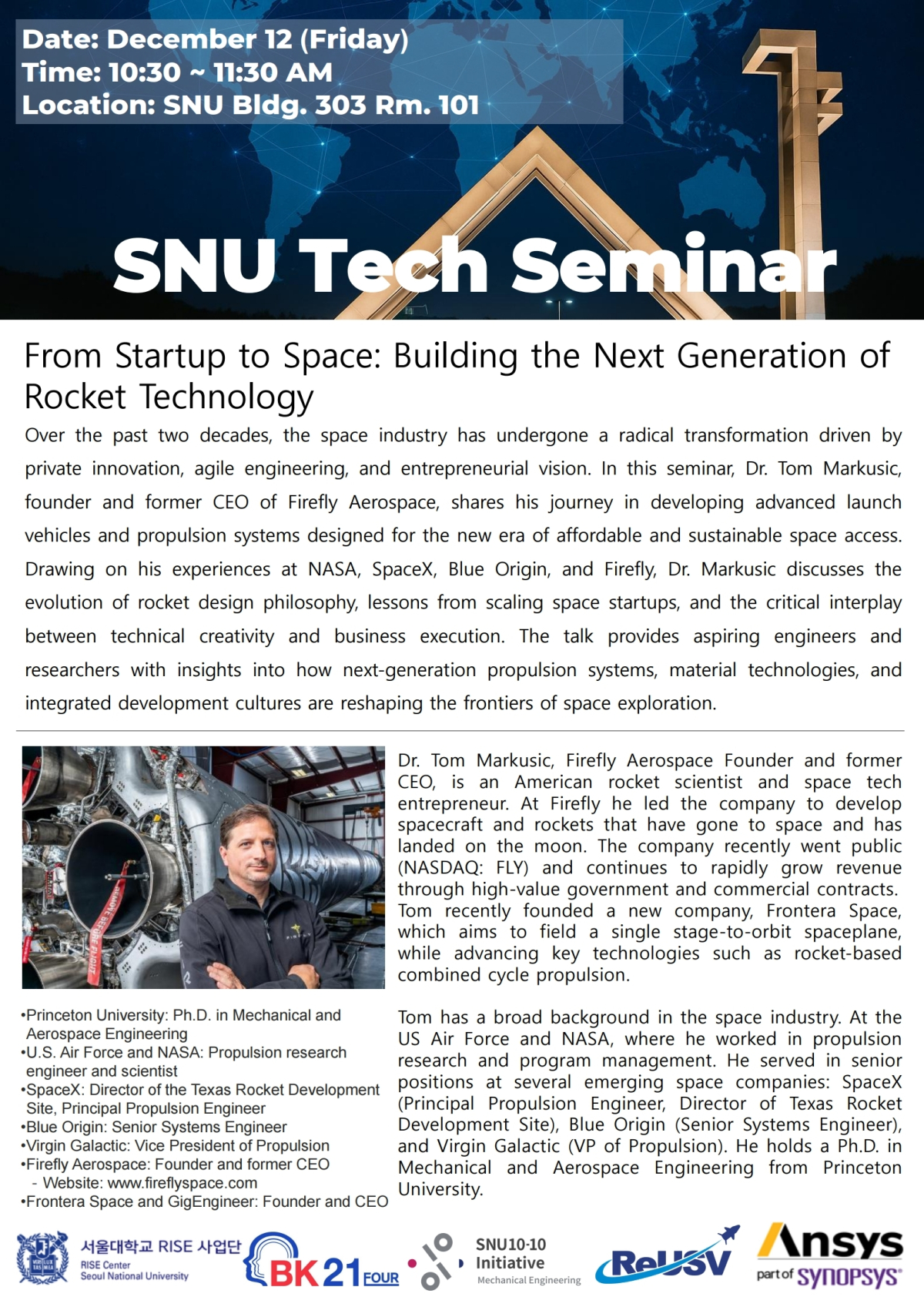 [홍보] SNU Tech Seminar(Dec. 12) - Dr.Tom Markusic, Founder of Firefly Aerospace